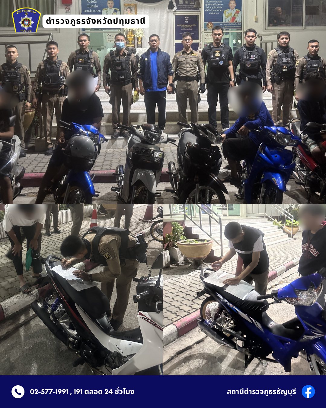วันที่ 21 กุมภาพันธ์ 2569 ภายใต้การอำนวยการของ พ.ต.อ.จรินทร์ อธิบธานนท์ ผกก.สภ.ธัญบุรี พ.ต.ท.ภัทราวุธ บุญยะพัน รอง ผกก.ป.สภ.ธัญบุรี พ.ต.ท.ธวัชชัย รัตนพาหุ รอง ผกก.สส.สภ.ธัญบุรี ปฏิบัติโดย พ.ต.ท.สุนทร สุขหน้าไม้ สว.สส.สภ.ธัญบุรี พ.ต.ต.เดชาวัฒน์ ใจดี สวป.สภ.ธัญบุรี ร.ต.อ.วรรณวนัช กลัดธนัง รอง สว.(สอบสวน)ฯ / เวร 2-0 ชุดปฏิบัติการสายตรวจที่ 3 ชุดปฏิบัติการสายตรวจที่ 4 ชุดปฏิบัติการสืบสวน 1 ดำเนินการตามนโยบายสำนักงานตำรวจแห่งชาติ, ตำรวจภูธรภาค 1 และ ตำรวจภูธรจังหวัดปทุมธานี เกี่ยวกับการแก้ไขปัญหาการแข่งขันรถในทางหรือขับรถโดยไม่คำนึงถึงความปลอดภัย การรวมกลุ่มหรือมั่วสุมโดยในลักษณะหรือพฤติการณ์ที่น่าจะเป็นการนำไปสู่การแข่งรถในทาง อันเป็นการก่อความเดือดร้อนรำคาญ และเป็นภัยต่อความสงบเรียบร้อยของสังคม รวมทั้งเพื่อเป็นการแก้ไขปัญหา ป้องกันกรณีวัยรุ่นรวมกลุ่ม มั่วสุม ส่งเสียงดัง ก่อความเดือดร้อนรำคาญให้กับผู้ที่พักอาศัยในบริเวณใกล้เคียง โดยเจ้าหน้าที่ตำรวจชุดปฏิบัติการ ร่วมกันปิดล้อมตรวจค้น กลุ่มบุคคลที่มารวมกลุ่มส่งเสียงดังก่อความเดือดร้อนรำคาญ บริเวณถนนเลียบคลอง หน้าหมู่บ้านธัญญาภิรมย์ คลอง 7 หมู่ 1 ต.ลำผักกูด อ.ธัญบุรี จ.ปทุมธานี ผลการปฎิบัติ ดังนี้